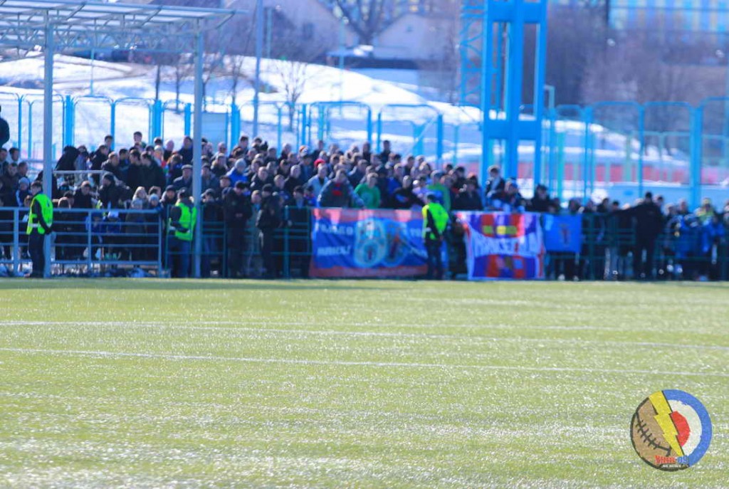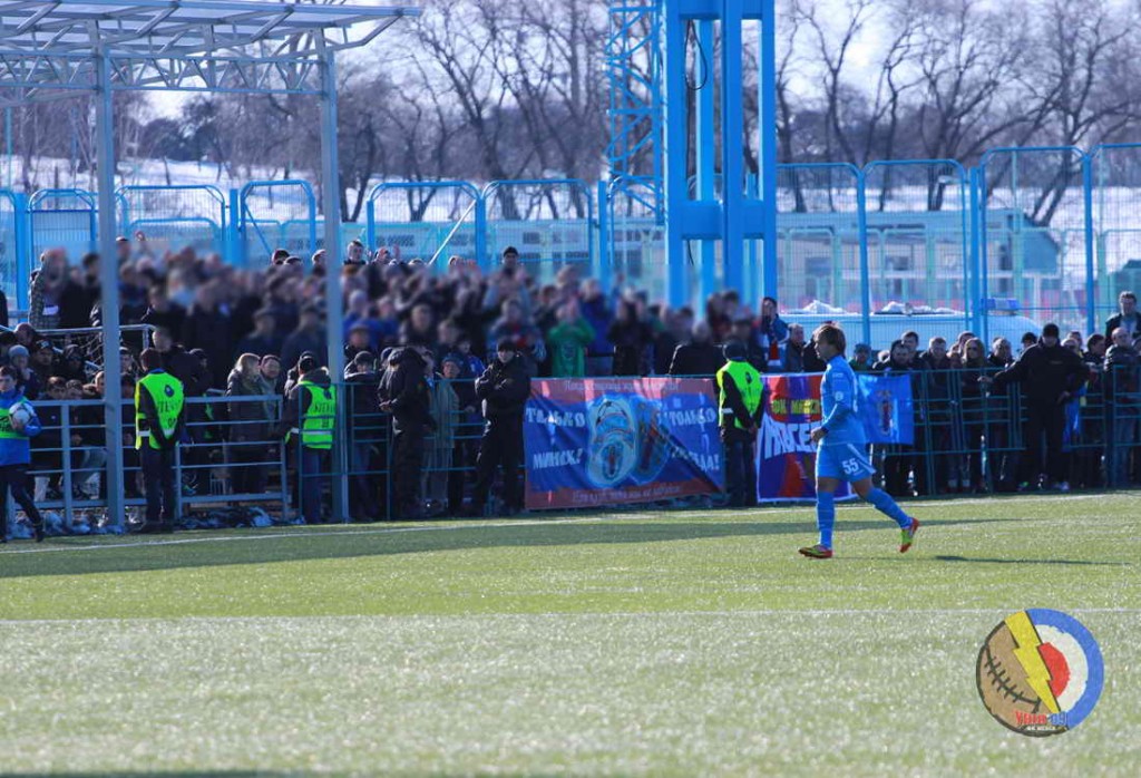 На сектары звыклая для апошніх гульняў колькасць ФКМ, прыкладна 80 чалавек, з не ідэальная падтрымкай, але месцамі даволі добрымі і доўгімі спевамі! Зарады гучалі як у падтрымку каманды, так і ў адрас так званых апанентаў — ганарлівых хлопцаў з-пад Менску. Што цікава, дык гэта тое, што АМАП, які дарэчы знаходзіўся каля сектароў побач з людзьмі ў накідках «STEWARD», вельмі лаяльна ставіўся да ўсяго гэтага, чаго я не ўзгадваю на мінулых «дэрбі». Ну напэўна варта зусім трошкі таксама ўзгадаць і пра так званыя каляфутбольныя мерапрыемствы ў гэты дзень. Ехаўшыя на гульню некаторыя фанаты ФКМ, якія вырашылі дабірацца да месца правядзення гульні разам, выйдучы на сваім прыпынку, заўважылі нездаровую колькасць лайна каля ўсяго манежа і побач з ім, такая колькасць карычневай бруднай масы не магла не паўплываць на настрой прыехаўшых на гульню хлопцаў, таму імі было прынята рашэнне папрасіць хлопцаў заняць свае месцы на тырбунах, бо гульня ўжо хутка павінна была пачацца. Іншая справа што спосаб быў абраны не зусім той, якога чакалі бела-Блакітныя (што было бачна па іх непаразумелых тварах і дзеяннях), «старая школа» ў 2013 годзе, вядома ж не падабалася Дачнікам, што відаць па балоне з пярцоўкай, скарыстанаму пад час гэтай тэмы з іх боку, так нават і па тэкстах ў інтэрнэце. Нядоўгая весялосць, АМАП, і г.д. Карацей весела і хуй з ім(с)