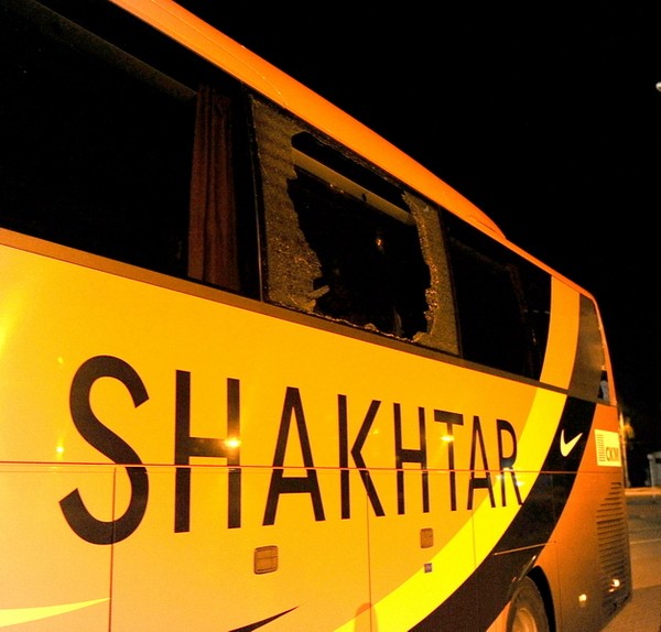 Отъезжающий автобус «Шахтера» был подвергнут настоящему артобстрелу – в машину полетели самые разные, но неизменно тяжелые предметы. Один из них разбил стекло по левому борту автолайнера, но поскольку тот был оснащен многослойным стеклопакетом, внутрь автобуса предметы не попали