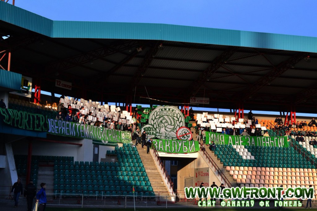 К матчу был подготовлен идейный перфоманс «доверяем тем, кто играет за клуб и имя, а не за деньги!». Спасибо парням из Могилёва и Слуцка что приехали поддержать нас в этой игре. Сектор гостей ни чем не отметился.