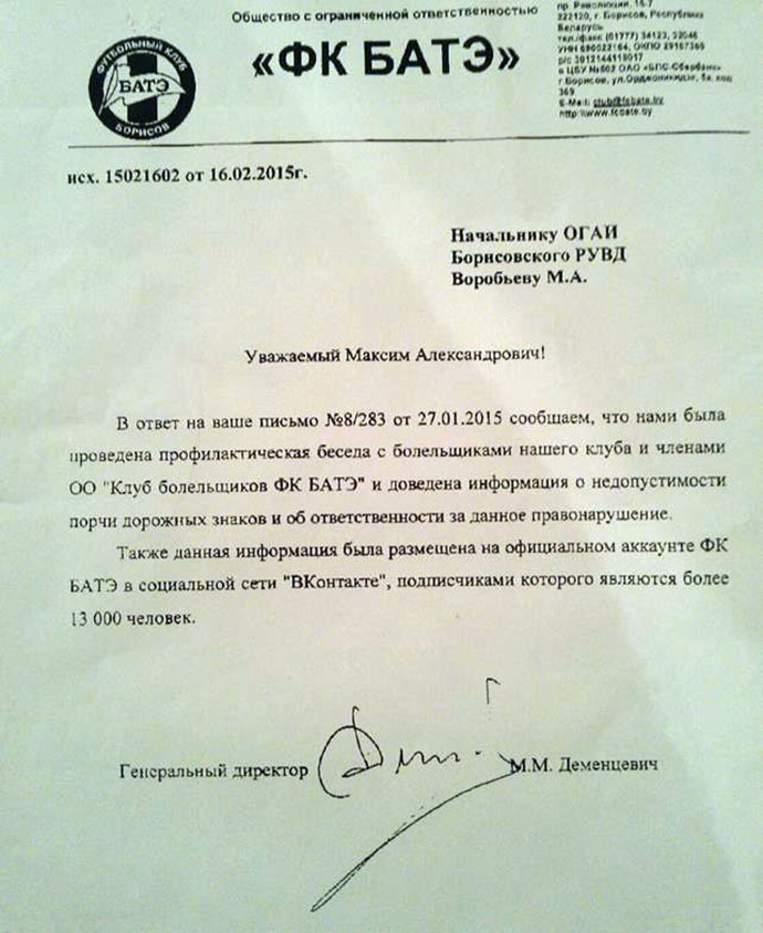 «Те, кто клеит стикеры на дорожные знаки, вряд ли задумываются о прямой связи между их, скажем так, шалостями, и этой самой безопасностью на дороге, — прокомментировал представитель ФК БАТЭ. — Но руководство клуба не может относиться положительно к такому поведению фанатов, из-за которого под ударом оказывается безопасность участников дорожного движения. Вопрос наклеивания футбольной символики касается всех стран и фанатов. Это действительно часть фанатской культуры. Бывая на выездных матчах в разных странах Европы, я видел обклеенные стикерами едва ли не целые городские районы, прилегающие к стадионам. Я бы назвал это элементом гордости за свой футбольный клуб и страну».