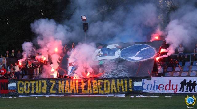 В начале матча висляки разворачивают 50-метровое полотно с надписью DUMNI FANATYCY.