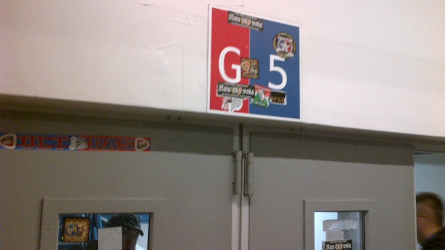 Сектор Пиаста, в связи с описанным выше, заполнялся в течение практически всего первого тайма. Поэтому рисованный перфоманс не растягивали, пока все не вошли. По этой же причине, до презентации ультры на ограждение не вешались большие флаги. В итоге все было презентовано в начале второго тайма. ”Оправа” являла собой Веселого Роджера с компасом в зубах. На ограждении появился рисованный готикой текстовик Piast Gliwice On Tour. Полотно снизу было подсвечено несколкими десятками стробоскопов (перед матчем ради интереса взялись пронести пиро – с их шмоном там танк протянуть можно, было б желание). Смотрелось круто. Голосовая поддержка гостей для такого количества очень даже ничего, но опять же очень тяжело шизить против целого стада.