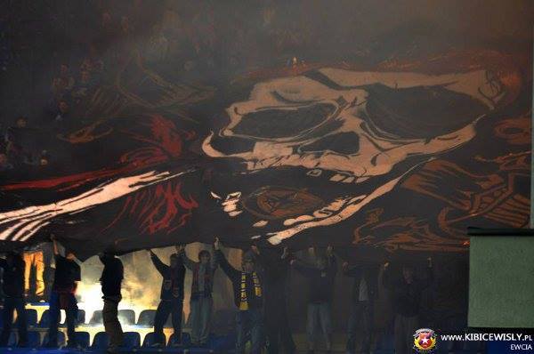 Сразу показалось, что запороли свою же ультру – тряпку растянули вверх ногами. Ан нет! Тряпка, как оказалось, не так давно была нахлобучена со склада Краковии. Изначально хотели растянуть ее на дерби, но матч должен был играться на стаде Краксы, что значительно снижало шансы ее пронести. Поэтому висляки решили не ждать дерби, а показать трофей на ближайшей игре. Самое интересное, что текстовик должен был быть лишь малой частью большого рисованного полотна. Которое, кстати, предназначалось на прошедший не так давно домашний матч с… Пиастом. Однако вся ”оправа” должна была еще сопровождаться большим количеством пиротехники. Что стопроцентно повлекло бы закрытие домашнего сектора на пару матчей. Поэтому ”pasy” решили не рисковать перед интересными матчами с Легией и Рухом и просто отложили данный замут. Да вот незадача – прочухали это дело висляки, да взломали склад с рисованной ультрой, откуда еще и краски вынесли на 500 евро.
