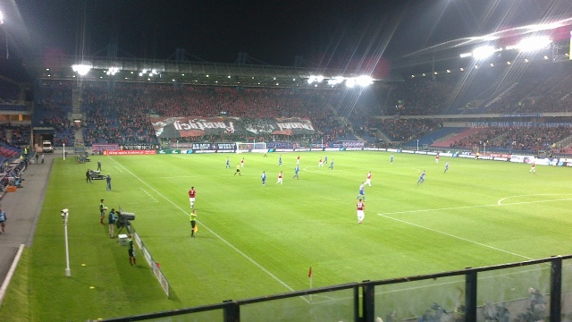 Вираж Вислы за воротами напротив. На вскидку тысяч 5. Млын очень внушительно смотрится, все на розах и красных майках.