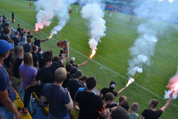 Стартовый свисток, начинается шиза. В начале первого тайма зажигаются РДГ, которые заволакивают дымом весь стадион, и матч останавливается на 5 минут, потому что не видно вообще ничего. Работник клуба потом подошел, и просто попросил, чтобы если будем палить — ничего не летело на поле. Всё! Что было бы с теми, кто зажег эти дымы в Беларуси — сами прекрасно понимаете.