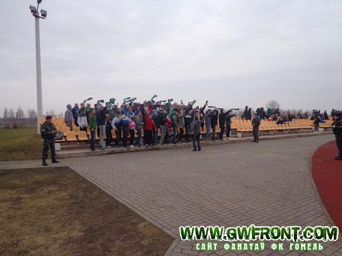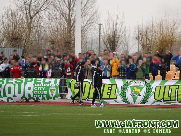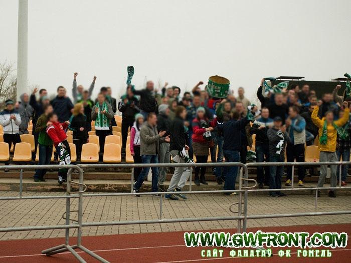 На выезд у Салігорск сабралася не меней за 75 фанатыкаў. Адна частка дабіралася на аўтобусе пад канвоем амапа і традыцыйным у такім разе шмонам пры ўваходзе. У выніку былі выняты некалькі стыкераў. Мабыць праваахоўнікі баяліся, раптам яны заснуць, а ім вочы залепяць))). Другая частка — гэта сабакары, якіх прыкаціла каля 25. Ну і трэццяя група — гэта сталічныя зялёна-белыя. Хацелася б адзначыць, што атмасферу ў вандраванні робіць кампанія выездзюкоў. І на гэтым выездзе атмасфера была на вышыні. Да гэтага матчу было падрыхтавана 2 палатна, прысвечаныя Матвейчыку і Астоічу, якія нажаль пакуль выступаюць не за Гомель. І калі «Матвейчык» быў у рэестры, то вось «Астоіч» з-за бюракратыі праваахоўнікаў не быў занесены. Пранеслі самастойна. Пасля размінкі і Моця і Сяржук падыходзілі да зялёна-белых, былі рады сустрэчы. Гасцявы сектар сабраўся аператыўна і падтрымка пачалася з першай хвіліны матчу. Усё было на вышыні: гучна, суладна, практычна без прыпынкаў, нават не ўвесь рэпертуар паспелі адшызець. Гарнякі ў першым тайме спрабавалі перакрыкваць, але дарэмна, а ў другім і зусім патухлі. Мы ж пасля гала Канцавога выкладваліся, як той казаў, «за сябе і тых, хто не прыехаў». І вось перамога, каманда падыходзіць дзякаваць за падтрымку. Гучыць зарад «малайчыны!» і паднімаюцца палотны Сяргею і Сяржуку і пачаўся тупняк з боку «людзей у чорным». Патрабавалі аддаць ім «Астоіча». Усюды ім Гес здаецца)) Але ўсё, разрулявалі і палатно з Сяржуком засталося ў зялёна-белых. Доўгачаканая першая перамога Гомеля пад кіраўніцтвам Мяркулава. Будзем спадзявацца, што зараз іх будзе паболей))