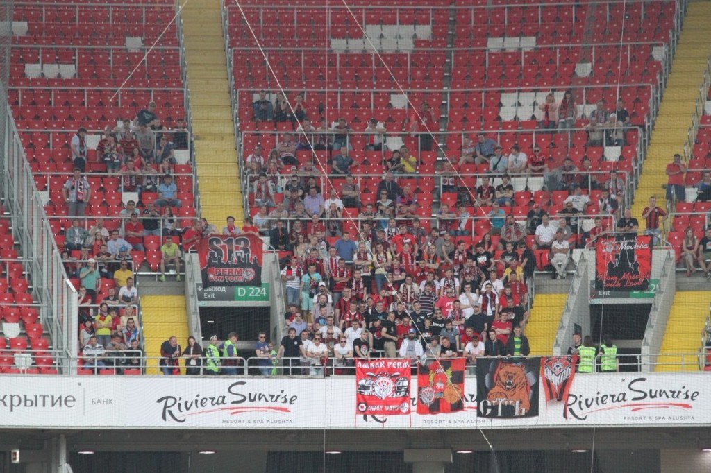 На секторе насчитал где-то человек триста – могу ошибаться, конечно. Низы заняла «Пермь Великая». Олдовые расположились выше. Я встал так, чтобы мой «Роджер» никому не мешал смотреть. На два ряда выше и слева – Танюшка и Анечка Амика. Рядом с ними, но чуть ниже – Валерка Браун, Саня Сандер, Костя Комар и Лёшка Алкофрибас. Справа – многочисленные Мэйкины. Как только началась игра, прибыл и Саня Ардент из Иваново, объяснил, что долго искал парковку, привёз с собой баннер. Мы его с трудом закрепили на скотч, ибо ветерок гулял, а в перерыве перевесили рядом с другими баннерами. Так вместе с Саней и осуществляли поддерживающий команду ор!! Но… Нет Портвейна! Лёшки Портвейна нет!!! Как же так? Он же летел с нами в самолёте??! Запереживали всем скопом. Высказывались различные версии, в том числе и самые зловещие. Я высказал осторожное предположение, что Лёшка жив, с ним всё в порядке и он смотрит данный ногомяч на ВИП-секторе, сидя в джакузи и окруженный белокурыми красавицами. А ведь почти так в итоге и оказалось!